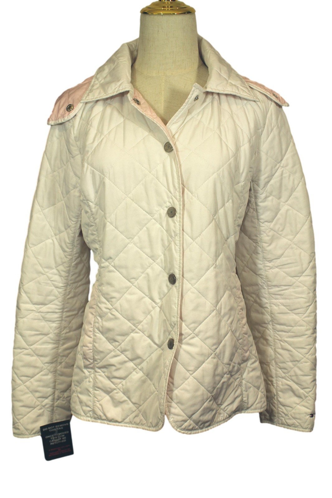 Stay stylish and warm this winter with this Tommy Hilfiger quilted jacket. The white body with pink trim offers a chic look. Note the detachable hood for versatile wear.